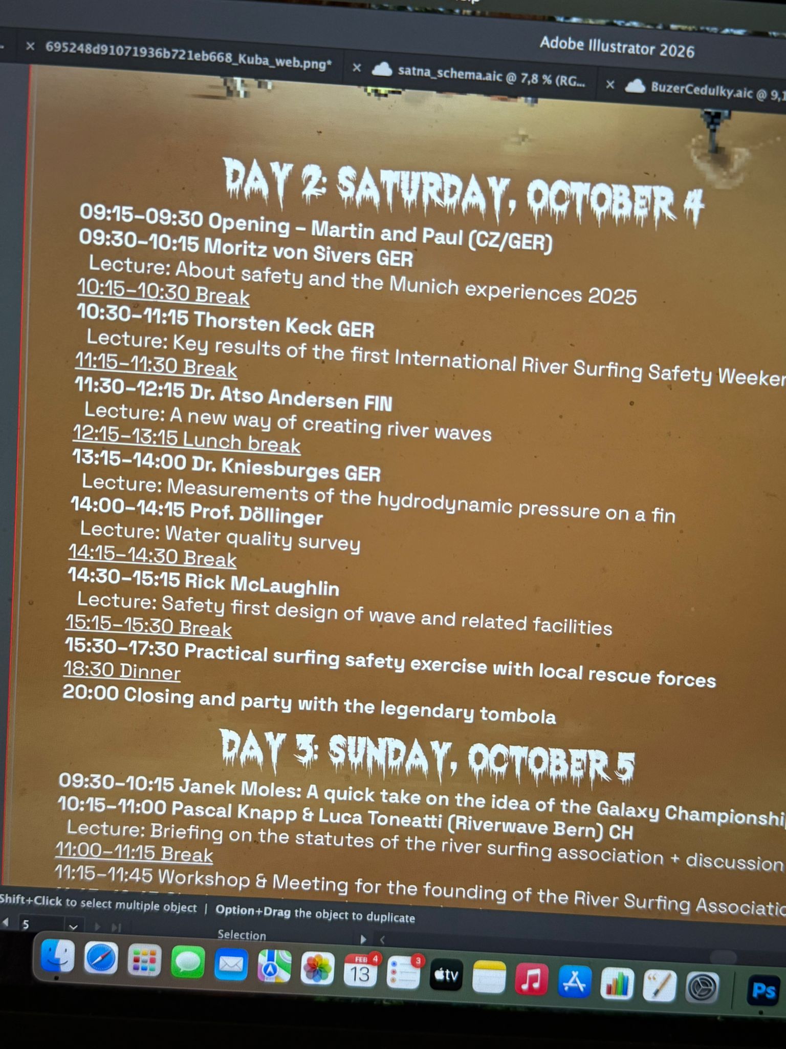 Nejzásadnější momenty ale přinesla diskuze o bezpečnosti. Moritz von Sivers a Thorsten Keck představili European Rapid Surf Safety Manifesto – novou „ústavu“ bezpečnosti na řece, která mimo jiné zavádí zákaz pevných leashů.